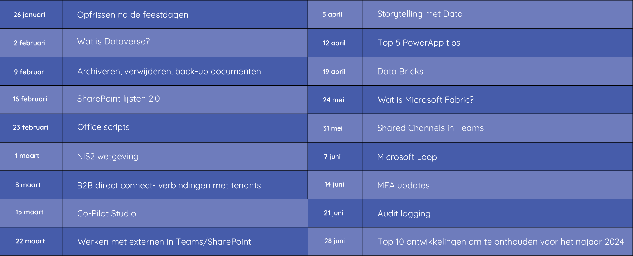 Vrijdags om half 10 geven we in een half uurtje jouw bedrijf informatie over een relevant onderwerp binnen SharePoint, Microsoft Teams of het PowerPlatform. Je kunt zelf kiezen aan welke Webinars je wilt deelnemen. Ons doel hierbij is om jou de verschillende onderdelen binnen Microsoft 365 te laten ontdekken, waardoor jouw bedrijf effectiever en efficiënter kan gaan (samen)werken. Deelname is vrijblijvend, het kost alleen een half uur van je tijd.